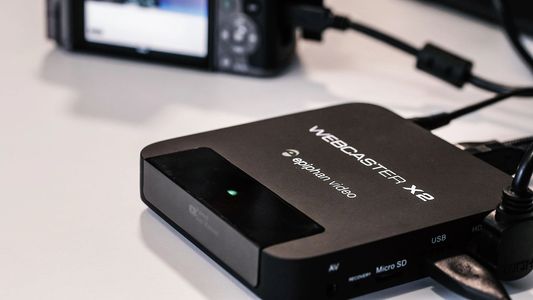 For simple, single camera livestreams that don't require graphics, our tool of choice is the Webcaster X2. The Webcaster is a dedicated hardware encoder for live streaming, enabling CAMP to stream your project on YouTube, Facebook Live, and more to create high-quality live content directly from our camera or any HDMI source.